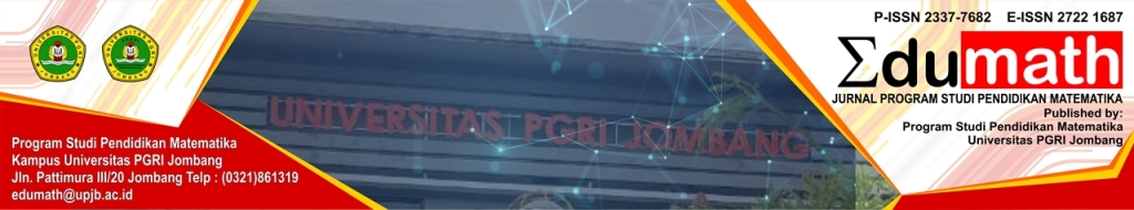 Edumath Mathematics Education Department of UNIVERSITAS PGRI Jombang published 4 times a year, in February, May, August and November,  intended to accommodate the results of research conducted by lecturers, teachers or students in the field of mathematics or mathematics education, pure mathematics research, research on applications of mathematics in everyday life and research on mathematical literature. The journal “eduMATH” already has a P-ISSN number of 2337-7682 and E-ISSN of 2722-1687 (online).